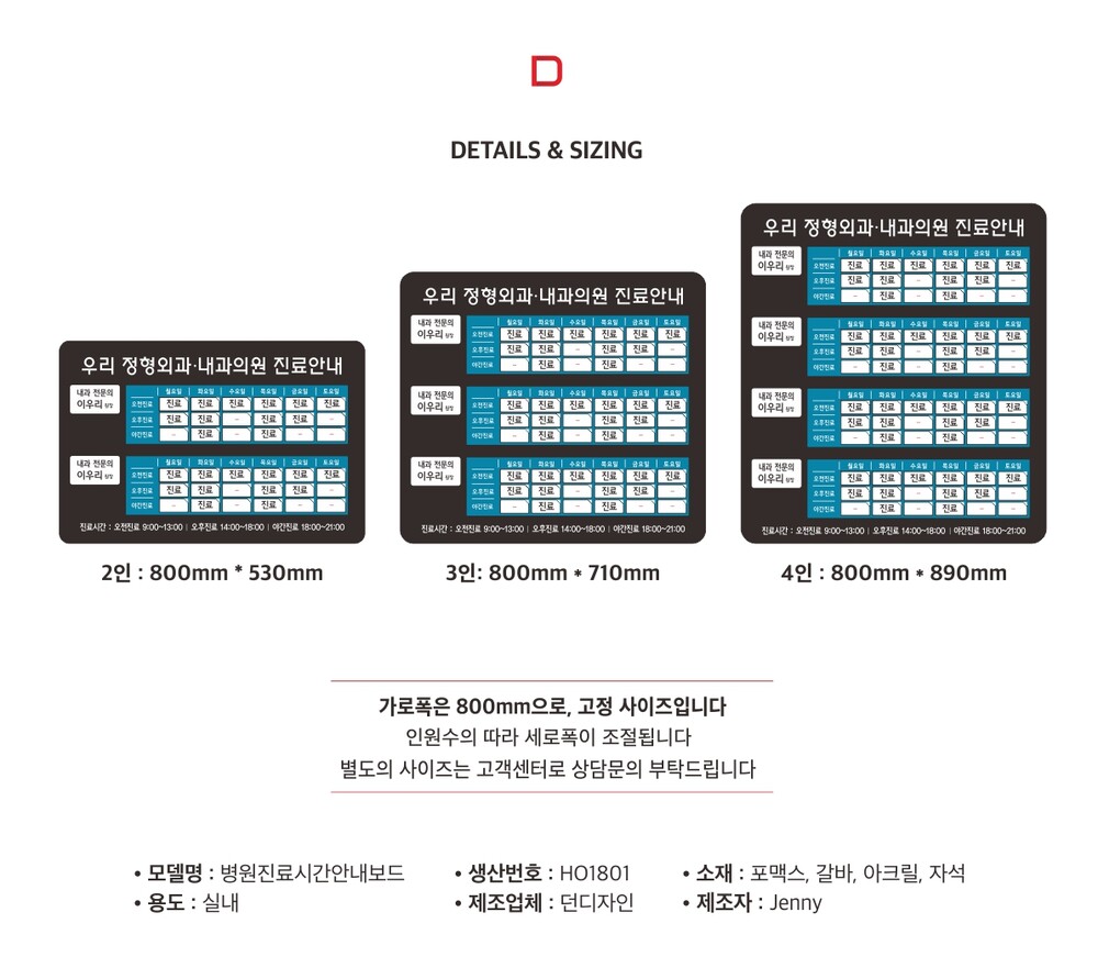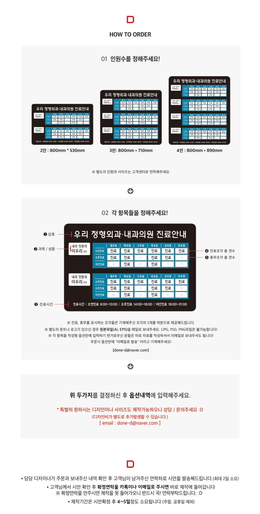상호, 과목/성함, 진료시간, 진료조각 총갯수, 휴무조각 총갯수를 결정하신 후 주문해주세요!