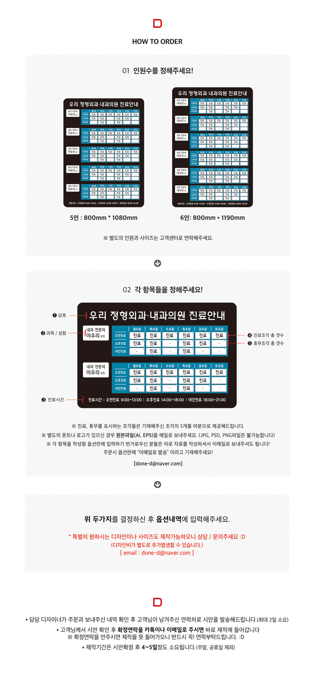상호, 과목/성함, 진료시간, 진료조각 총갯수, 휴무조각 총갯수를 결정하신 후 주문해주세요!