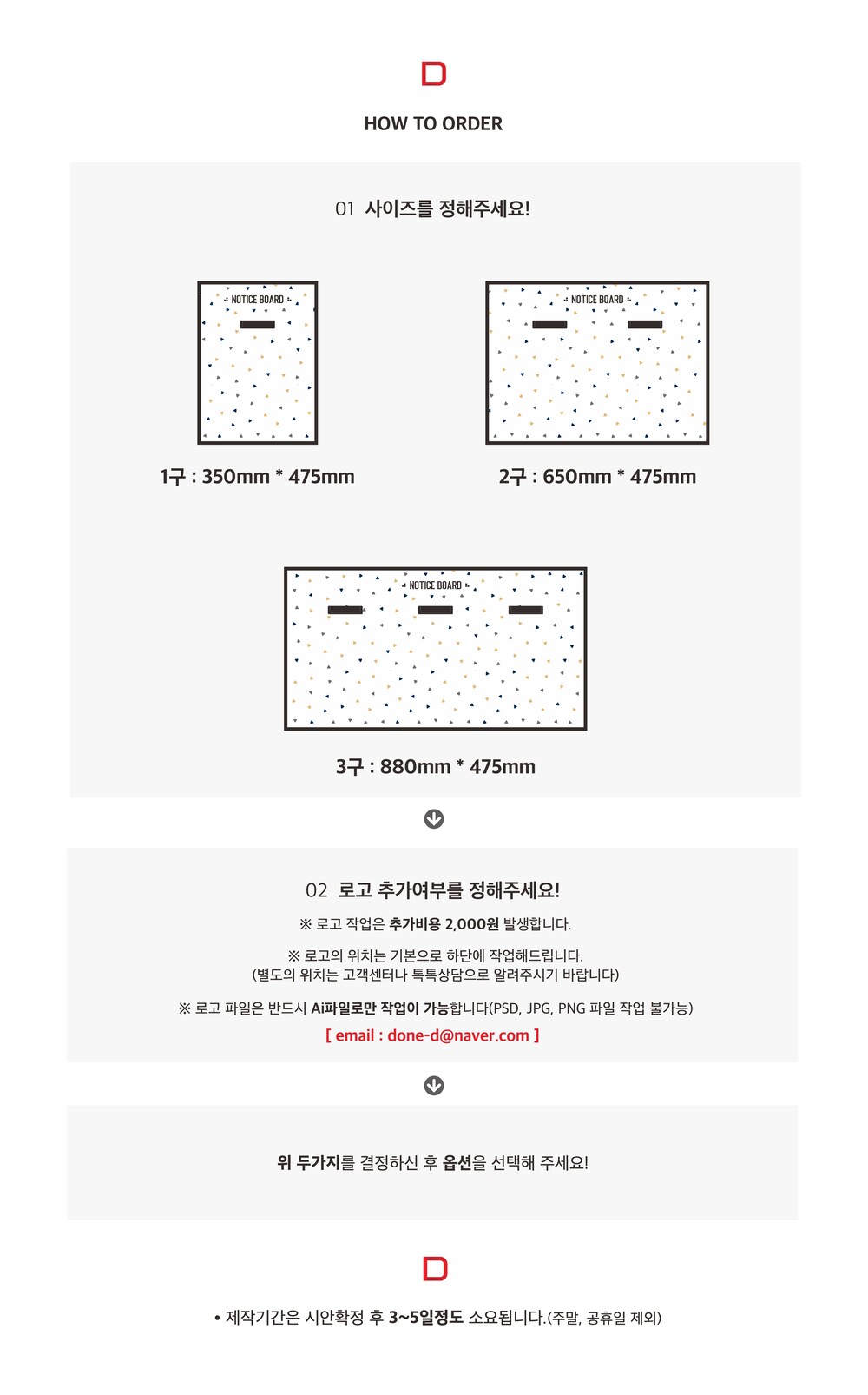 * 로고를 삽입하실 경우에는 원본파일(Ai, EPS)을 메일로 보내주세요(JPG, PSD,PNG 파일은 불가능) ▶ done-d@naver.com