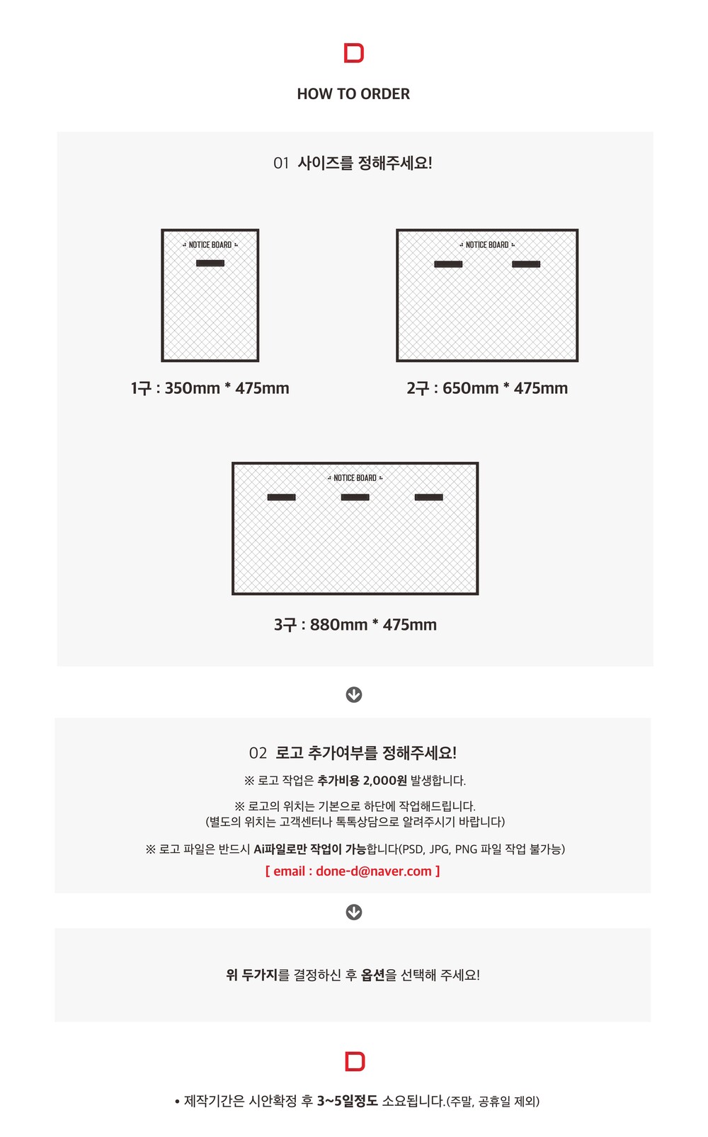* 로고를 삽입하실 경우에는 원본파일(Ai, EPS)을 메일로 보내주세요(JPG, PSD,PNG 파일은 불가능) ▶ done-d@naver.com