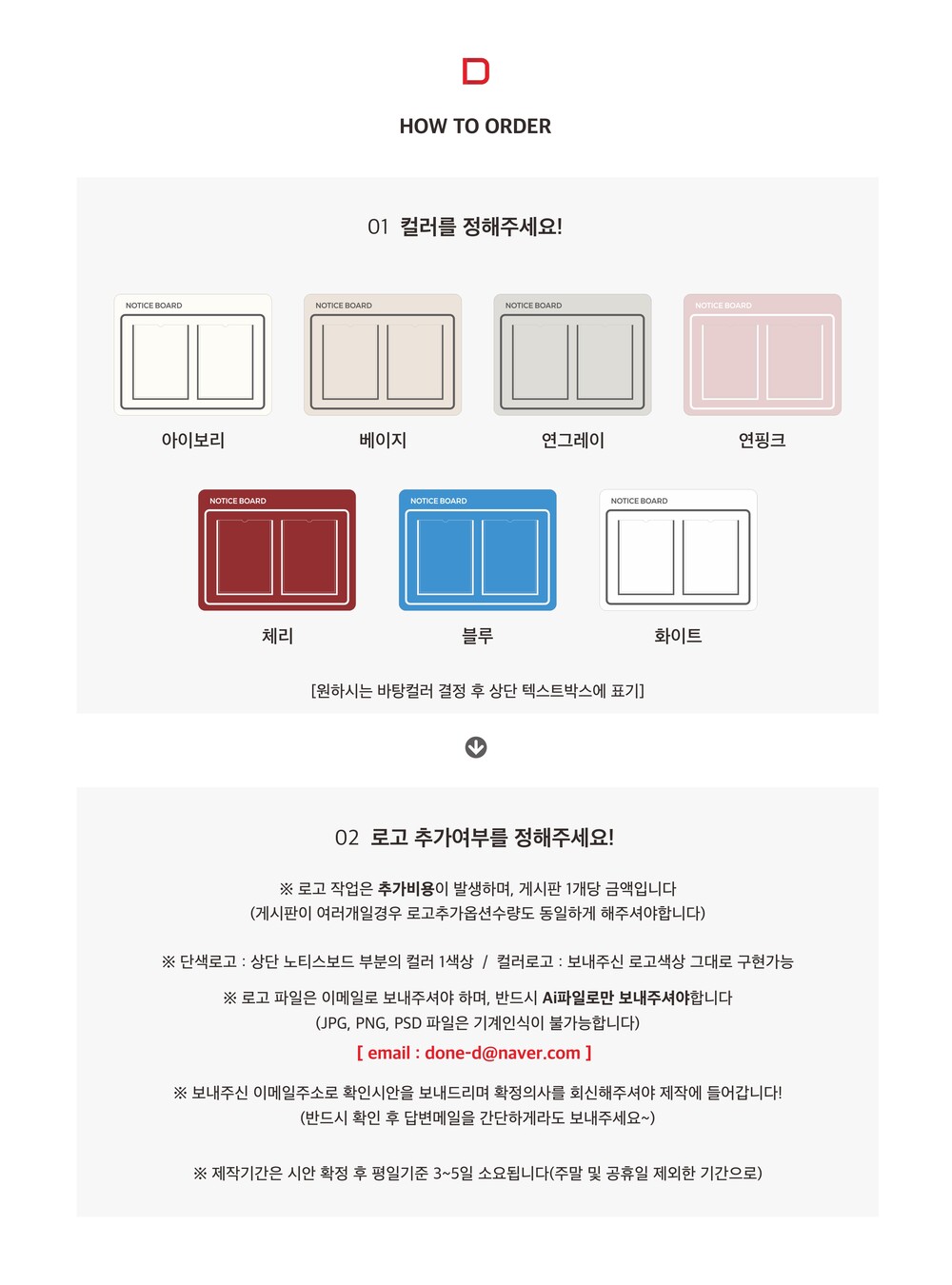 * 로고를 삽입하실 경우에는 원본파일(Ai, EPS)을 메일로 보내주세요(JPG, PSD,PNG 파일은 불가능) ▶ done-d@naver.com