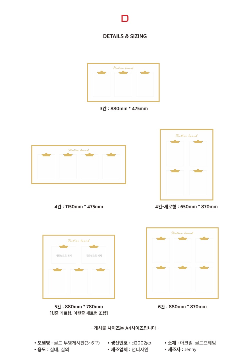 Gold Clear Notice Board(3~6칸)